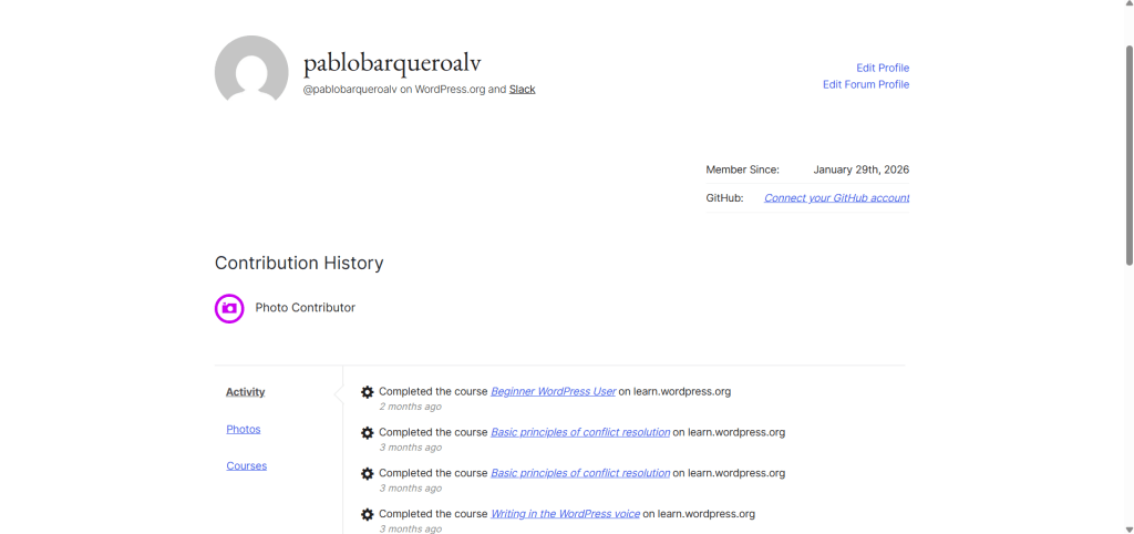 - Como parte de mi formación universitaria y de proyecto de curso, decidí unirme a la comunidad global de WordPress y contribuir desde mi área de interés: Fotografía.
