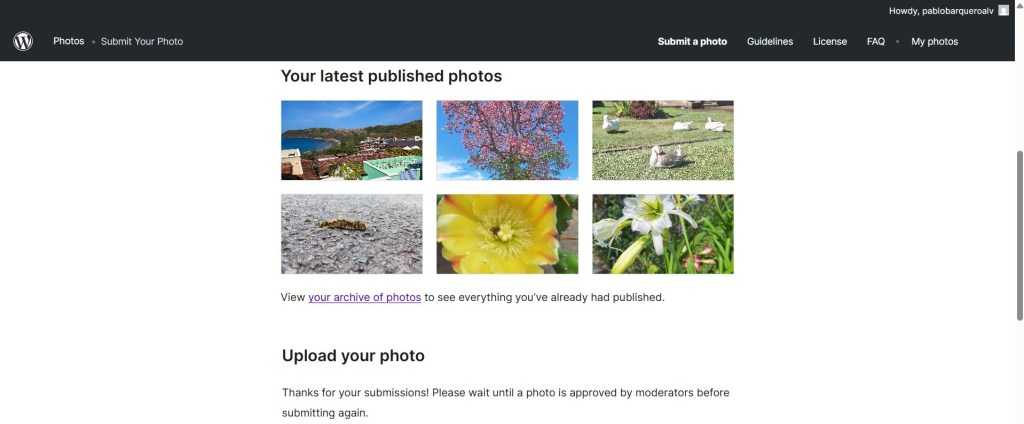 - Si tuviera que repetir el proceso, implementaría un sistema de filtrado más adecuado antes de entrar a la plataforma de WordPress. Para mitigar la ineficiencia del sistema de carga (solo permite enviar 5 fotos a la vez y te obliga a subirlas de una en una) también de esta forma, el tiempo que se pierde por la lentitud del sitio, las malas observaciones de los moderadores y el límite de carga no afectaría tanto el cronograma de entrega.
